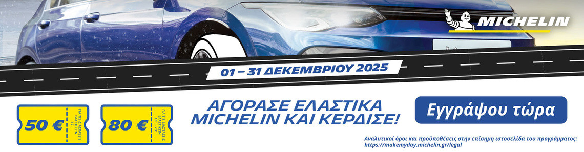 Αγόρασε 4 ελαστικά MICHELIN, All Season από 01/12 έως 31/12 και κέρδισε ένα e-voucher της επιλογής σου, αξίας έως και €80, ανάλογα με τη διάσταση των ελαστικών σου.